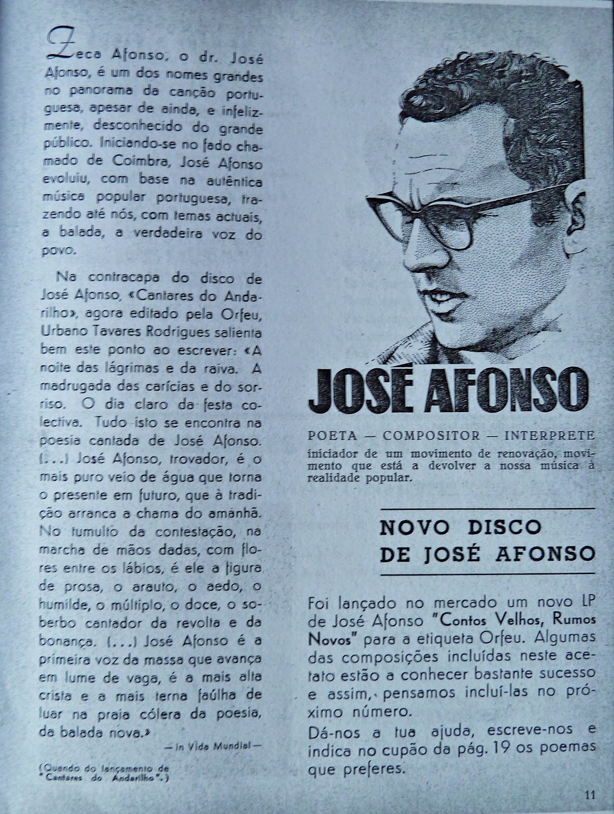 Foi logo no seu 1º número que surgiu Zeca Afonso, para além do Padre Fanhais e outros. Uma revista que veio dar uma pedrada no charco face ao nacional cançonetismo "porreiro" vigente no Estado Novo. Foi uma lufada de ar fresco no panorama musical cinzento existente, dando a conhecer ao seu público, os que posteriormente foram designados por cantores de intervenção. Objetos de censura nunca deixaram de lutar por um país novo e livre de mordaças.