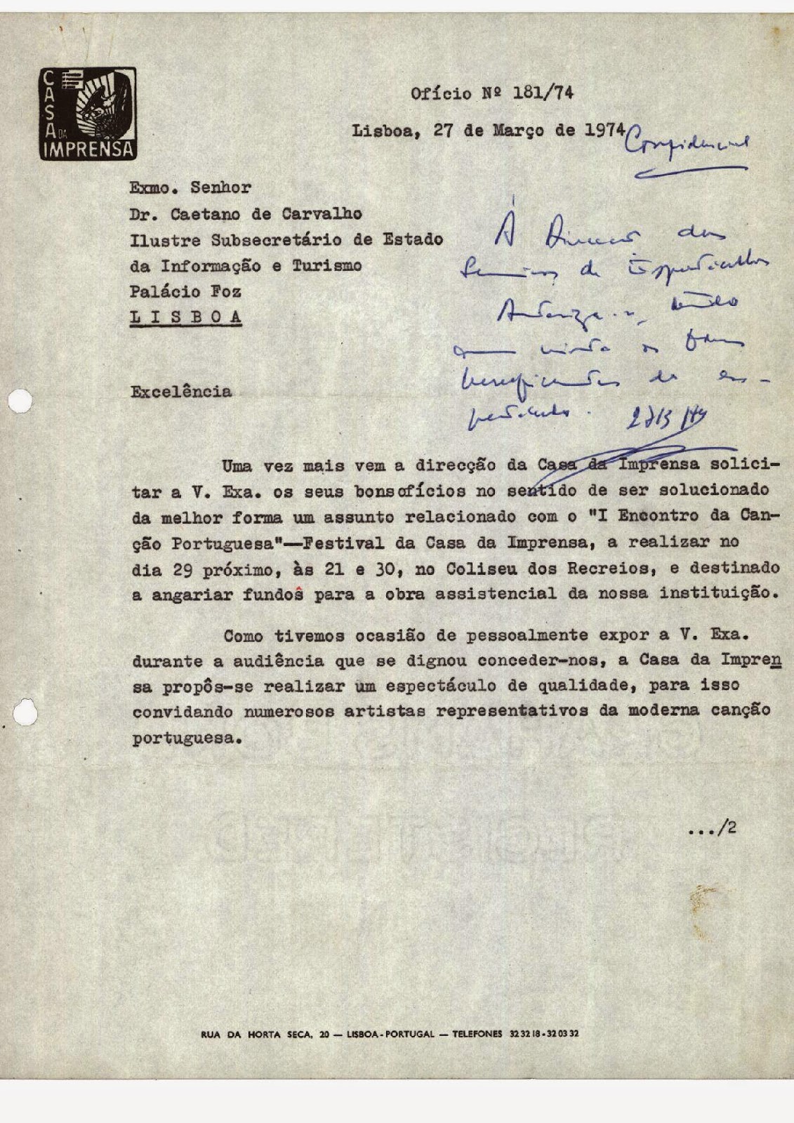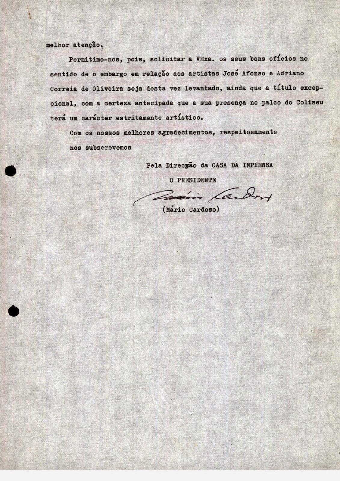 Carta da Casa da Imprensa a contestar a intenção de se proibirem as atuações de Zeca Afonso e Adriano Correia de Oliveira.