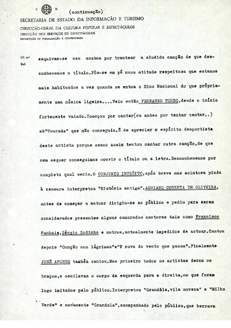 Como todos sabemos o espetáculo esteve em vias de não se efetuar devido à entrega tardia das letras que podiam ser cantadas nesse concerto. Pelos vistos o fiscal que levou as letras não era de se apressar para estas coisas. Mas o espetáculo realizou-se e foi marcante na vida de todos os que a ele assistiram, não só pelo policiamento que houve fora do Coliseu, mas pelo ambiente que dentro se viveu e, como diz no recorte do jornal incluso: