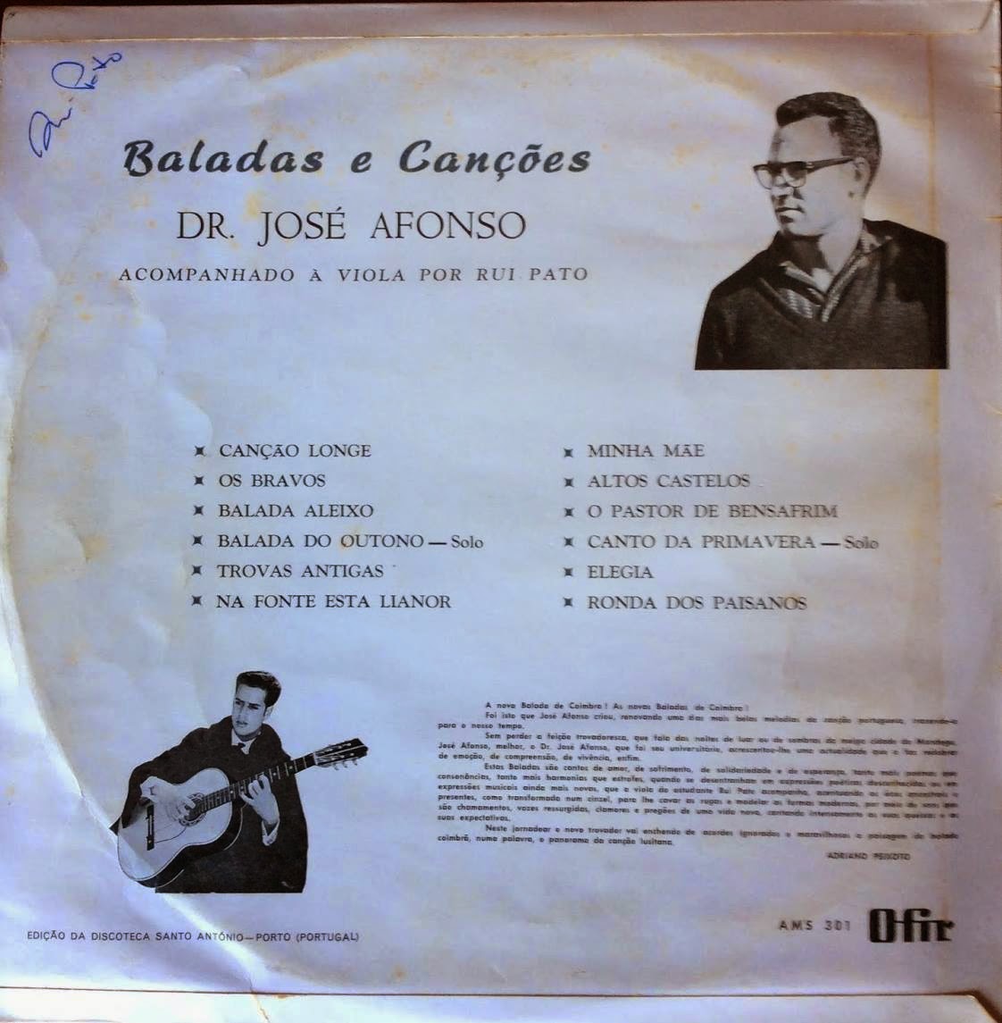 "A Nova Balada de Coimbra! As novas Baladas de Coimbra! Foi isto que José Afonso criou, renovando uma das mais belas melodias da canção portuguesa, trazendo-a para o nosso tempo. Sem perder a feição trovadoresca, que fala das noites de luar ou de sombras da meiga cidade do Mondego, José Afonso, melhor, o Dr. José Afonso, que foi seu universitário, acrescentou-lhe uma actualidade que faz redobrar de emoção, de compreensão, de vivência, enfim. Estas baladas são cantos de amor, de sofrimento, de solidariedade e de esperança, tanto mais poemas que consonâncias, tanto mais harmonias que estrofes, que a viola do estudante Rui Pato acompanha, acentuando os ecos ancestrais e presentes, como transformada num cinzel, para lhe cavar sons que são chamamentos, vozes ressurgidas, clamores e pregões de uma vida nova, cantando intensamente as suas queixas e as suas expectativas. Neste jornadear o novo trovador vai enchendo de acordes ignorados e maravilhosos a paisagem da balada coimbrã, numa palavra, o panorama da canção lusitana."
