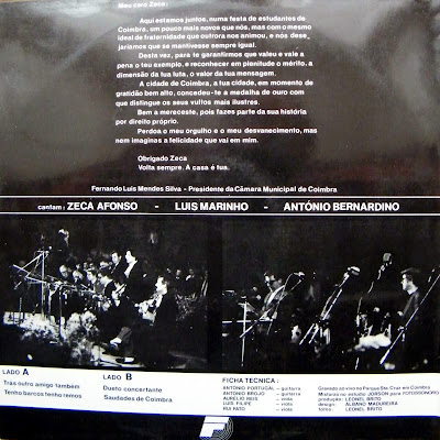 Este disco “Zeca em Coimbra”, conta com a participação dos cantores Luís Marinho (Traz Outro Amigo Também), António Bernardino (Tenho Barcos, Tenho Remos), dos guitarristas António Portugal, António Brojo e dos violas Aurélio Reis, Luís Filipe e Rui Pato. “Saudades de Coimbra” cantada pelo Zeca Afonso que está no disco, não é o original desse evento. (ver tema A Fraude).